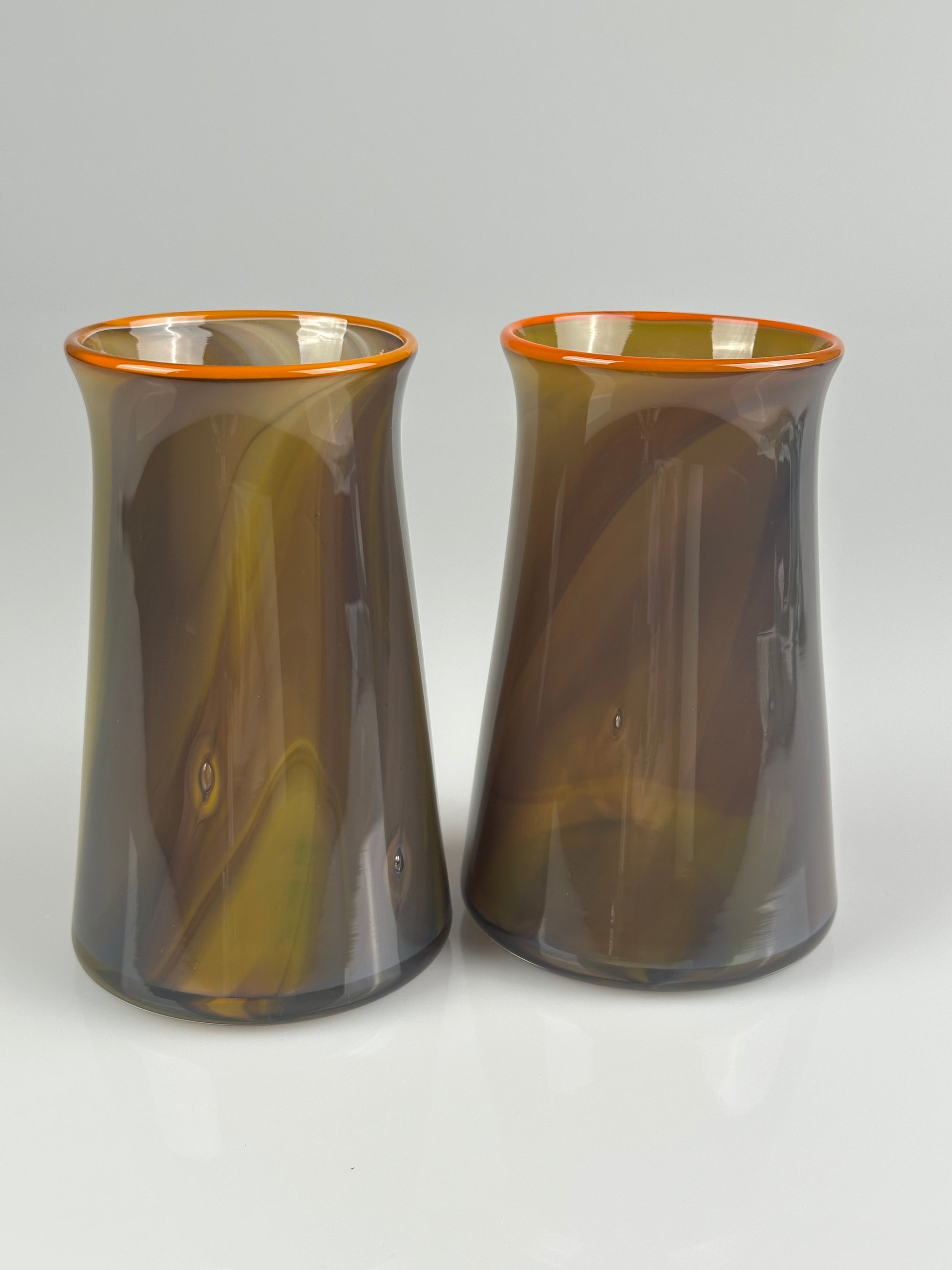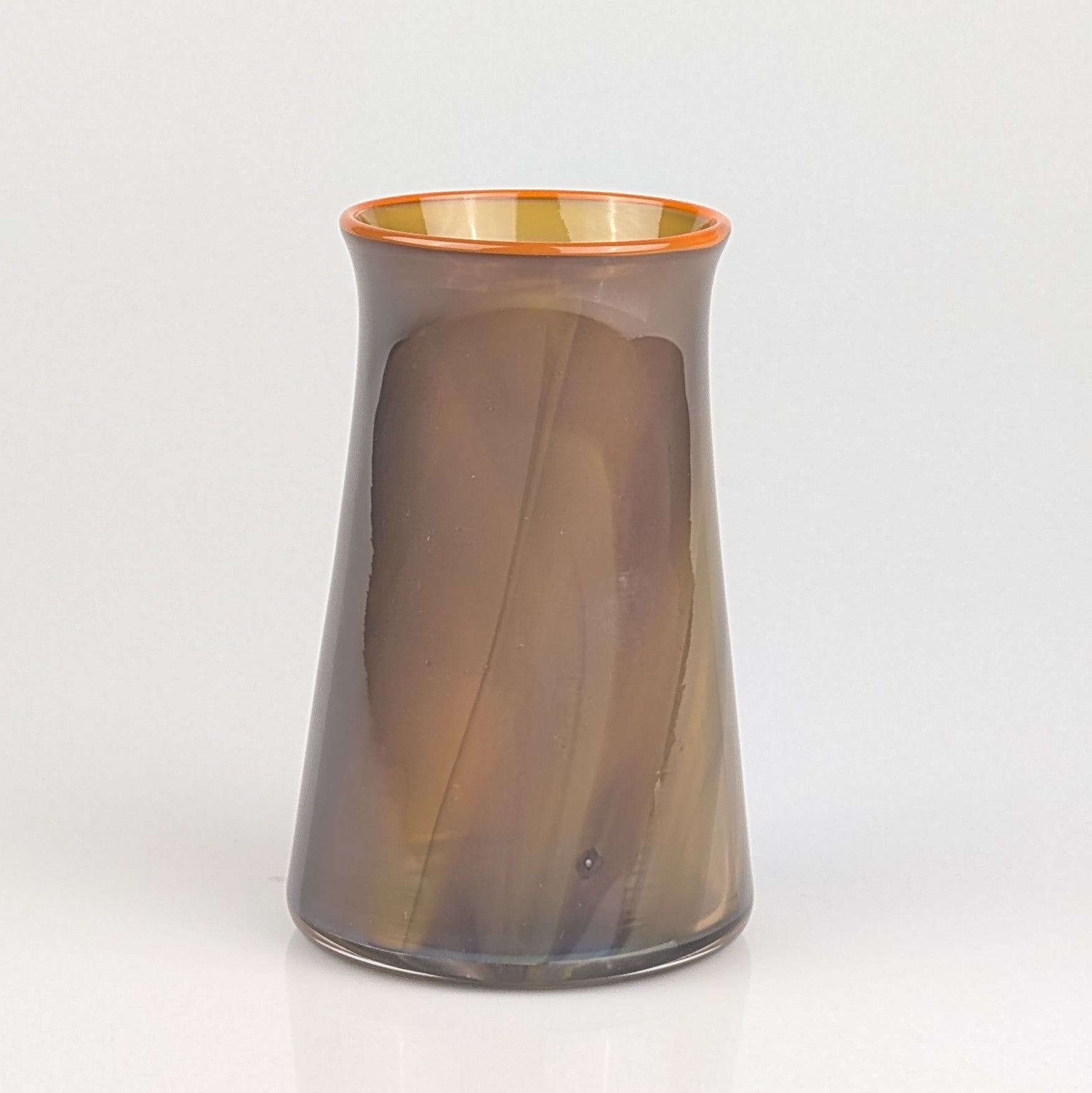 Hot glass, chemistry, alchemy, a vessel born of predictable surprise! What as once white and orange glass color transform through fire into a captivating burnt smoky swirling mixture.