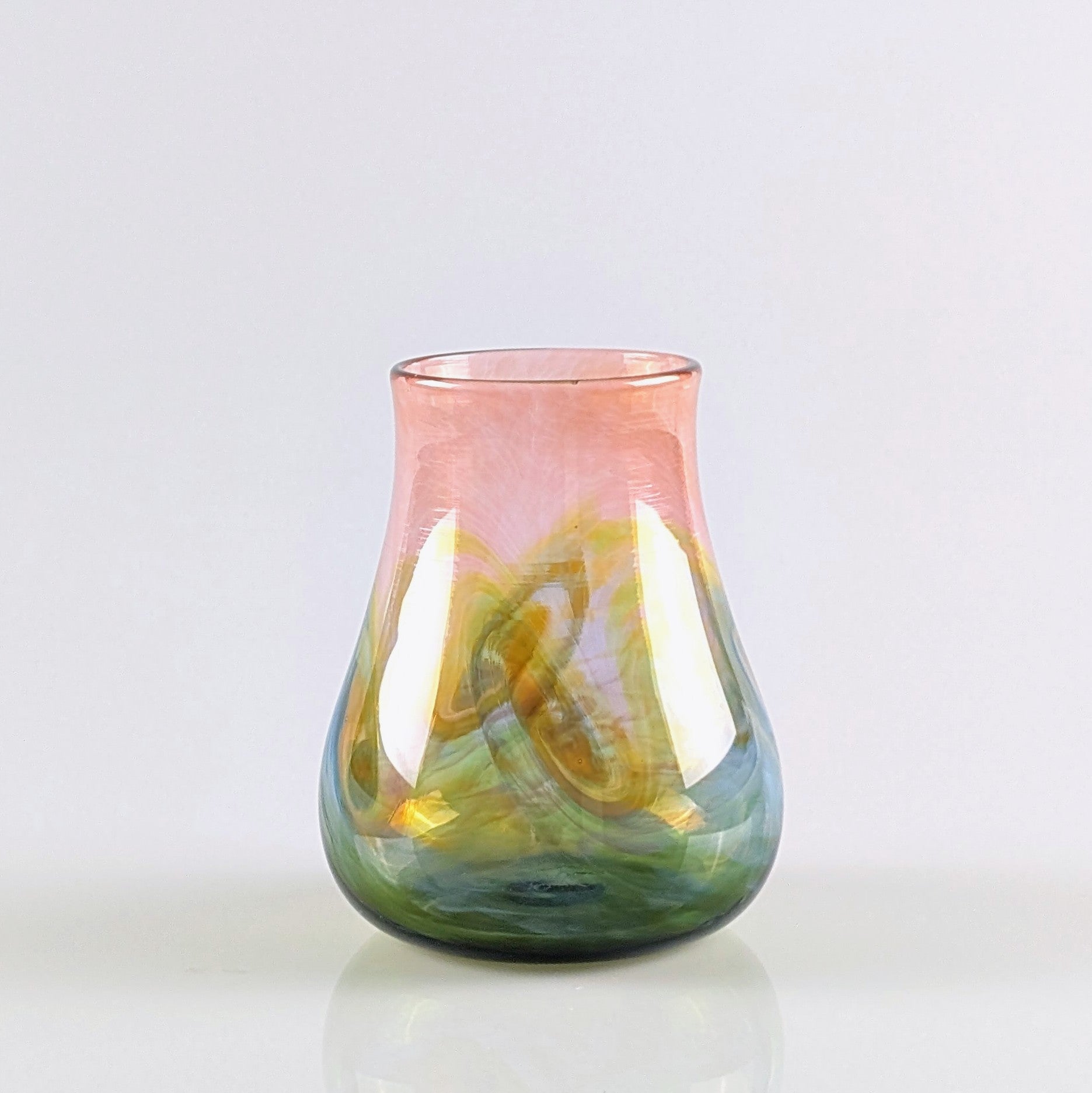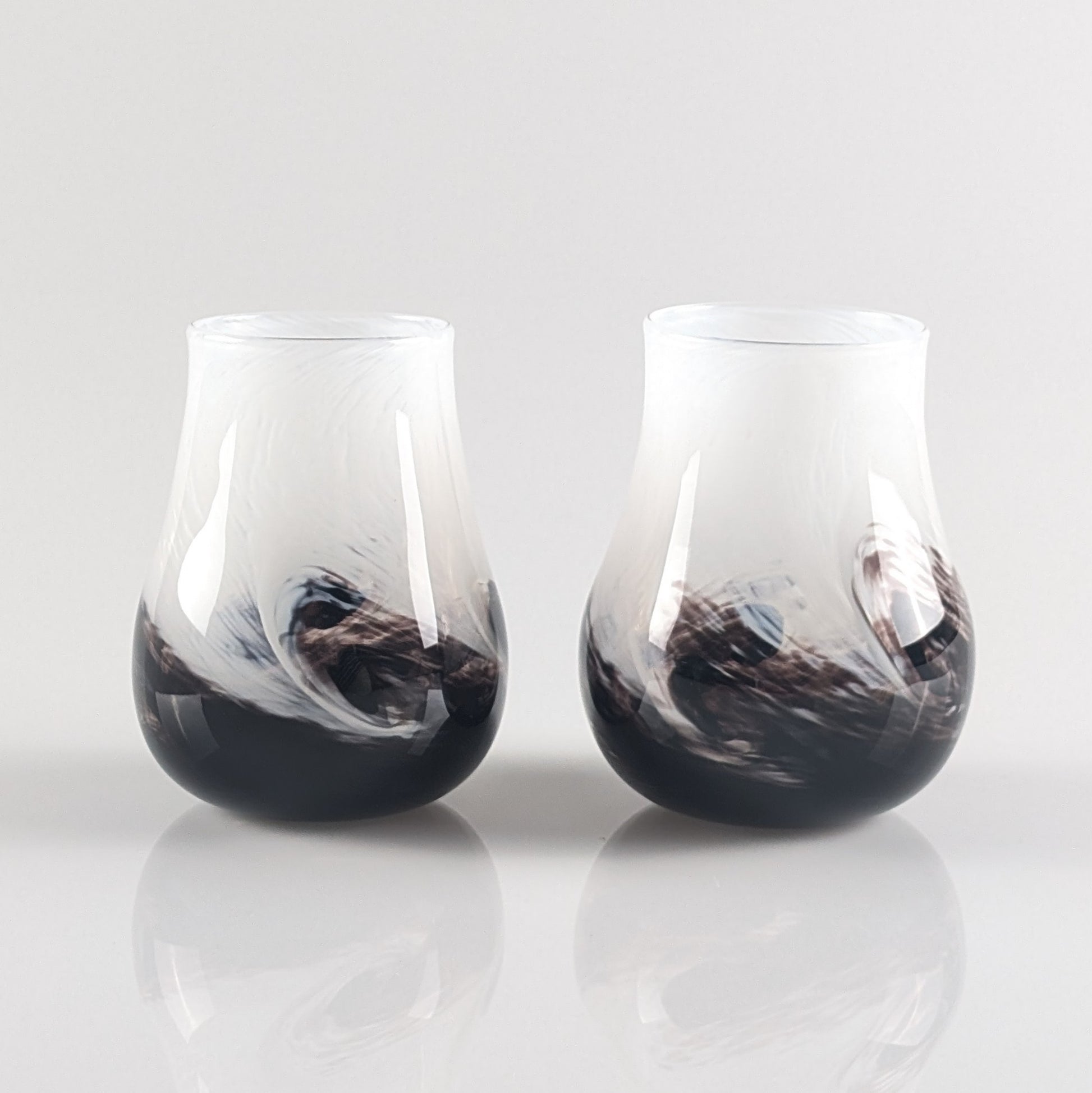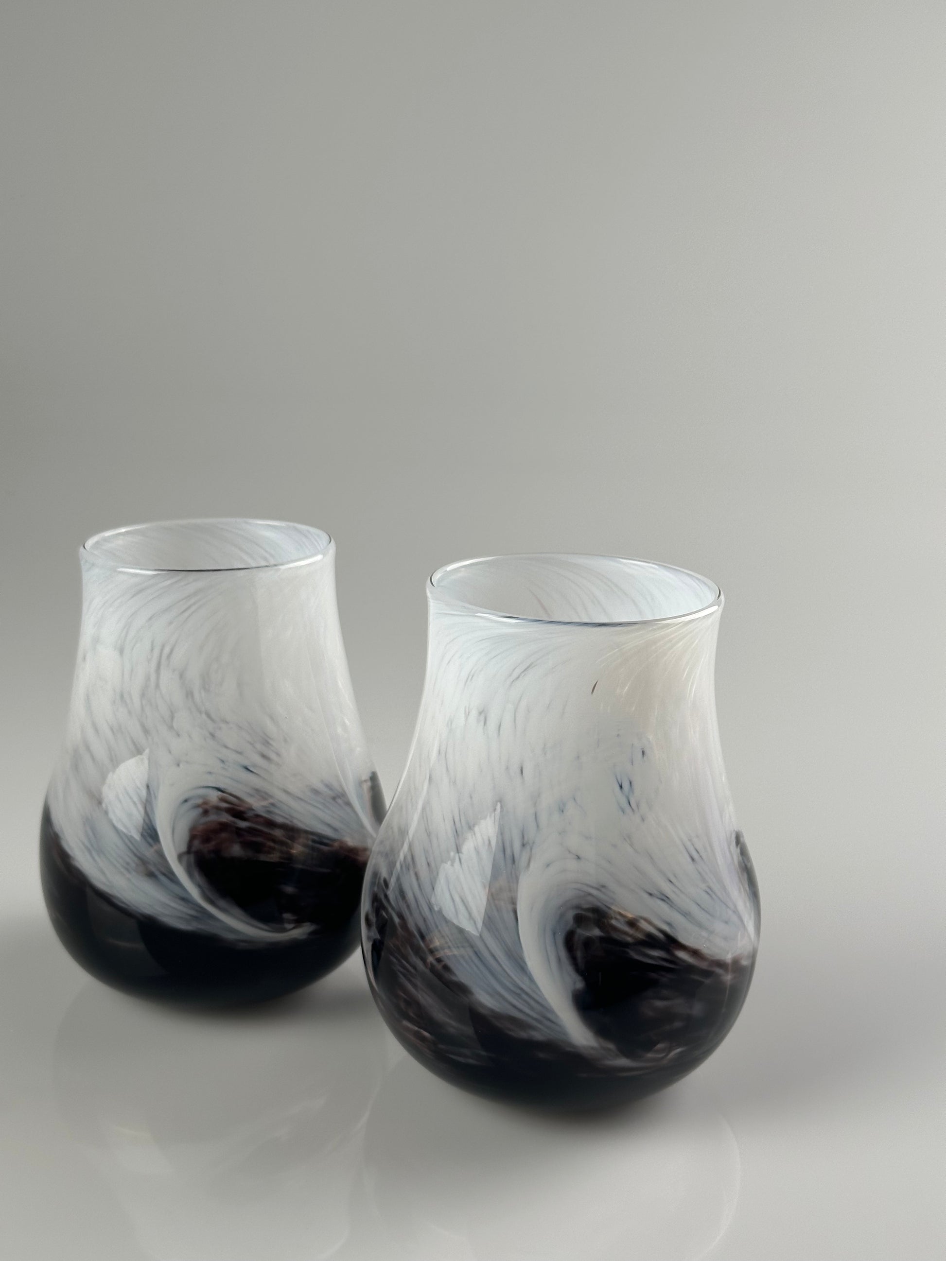 An elegant and playful drinking glass for any and all kinds of drinkers. Wine, water, juice etc. Any fluid will be accentuated by the flowing colors, pattern and form of this vessel.